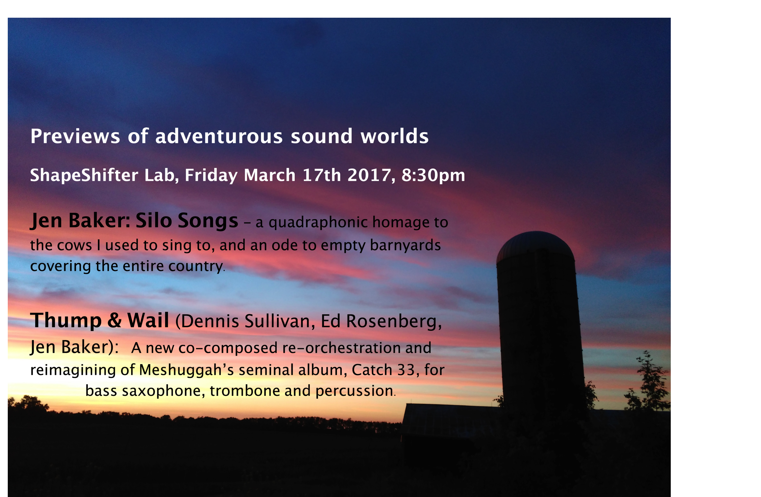 Jen Baker, quad speaker playback from silo field recordings, trombone, voice, movement